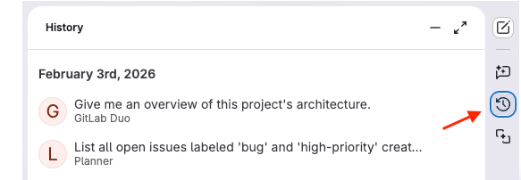 To review the work you've done, you can go back to your previous chats. On the GitLab Duo sidebar, select GitLab Duo Chat history ({history}).